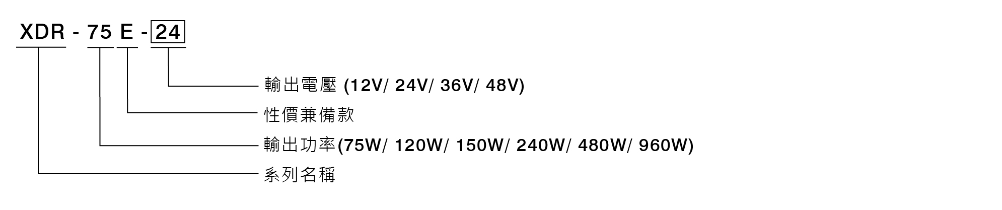 XDR-E 系列:75W~960W 全新世代 1Ø 輸入超薄性價兼備導軌電源