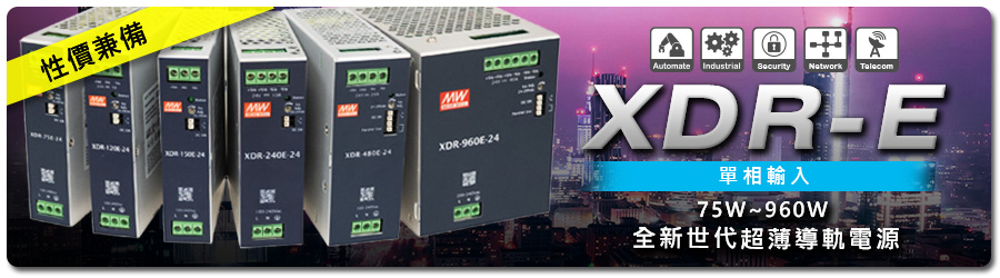 明緯 SDR / NDR / EDR 三系列 75W~960W 上市至今 10 多年,備受市場肯定,銷售累計高達數千萬台,廣泛應用於工業自動化、電力設施、新能源設備、網路交換機、或半導體製程設備….等,為了提供更超值選擇,重磅推出了全新家族 XDR-E 系列 - 75W/120W/150W/240W/480W/960W。