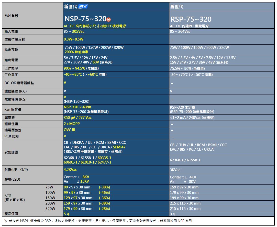 全新 NSP 系列以更高性價比全面超越 RSP 系列,體積大幅縮小,工作溫度範圍擴大至 -40~+85℃,在 +60℃ 仍可滿載運行,適用更嚴苛環境;同時通過資通訊、工業、醫療、家電與新能源等多領域安規認證,耐用可靠。NSP 系列可取代舊世代,搭配實惠價格,保固年限延長,強化系統降本增效,是為新案設計首選。