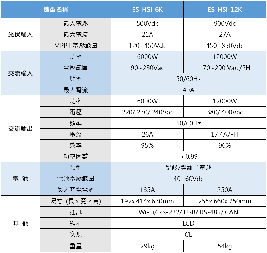 ES-HSI系列採用雙路MPPT輸入設計,可選擇多組太陽能模組配置,有效提升發電效能。同時支援併網與離網應用,停電時仍可維持關鍵負載穩定供電。配備HMI液晶顯示器,顯示運轉狀態;內建Wi-Fi,可透過APP遠端監控,即時掌握發電、電池與負載資訊。支援可程式化設定太陽能、電網及電池的供電優先順序,依電網電價或備援需求靈活切換,降低用電成本,也可接入燃油發電機。此外,最多支援9台並聯運行,便於後續擴建;內建BMS(RS485)通訊介面,相容鉛酸與鋰電池。5年長效保固,品質有保障