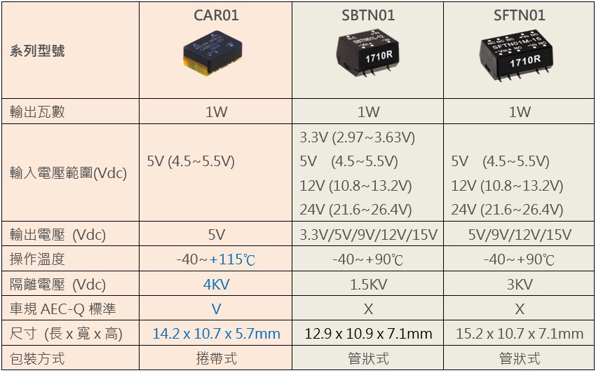 CAR01系列 : 1W SMD封裝非穩壓隔離DC-DC轉換器