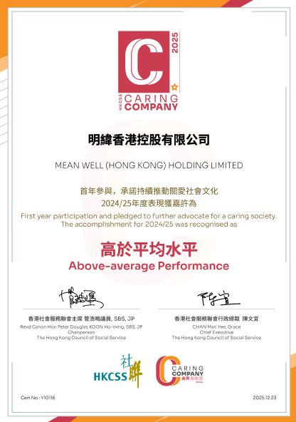 香港明緯在公益夥伴「綠領行動」及「防止虐待兒童會」的推薦下,甄選2024/25年度「商界展關懷」計劃,榮獲「高於平均水平」的嘉許標誌,這標誌肯定了香港明緯在可持續發展實踐中的卓越貢獻。