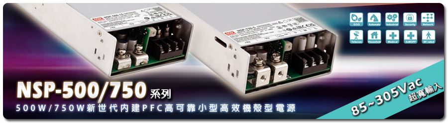 明緯針對內建PFC的機殼型標準工業電源,在推出革新性的 NSP-75/100/150/200/320 系列後,向上延伸新推出 NSP-500/750 全新系列。相較已銷售逾 10 年的舊世代 RSP-500/750,NSP-500/750系列具備更高性價比,並在多項關鍵規格全面升級:體積縮小33%、更高效低耗、支援 200% 峰值功率、-40~+85℃更寬工作溫度、5 年質保更耐用可靠,且一機涵蓋五大安規領域,適用於 工業自動化、通訊設備、安防監控、醫療應用、智能家居、新能源系統 …..等各種領域。