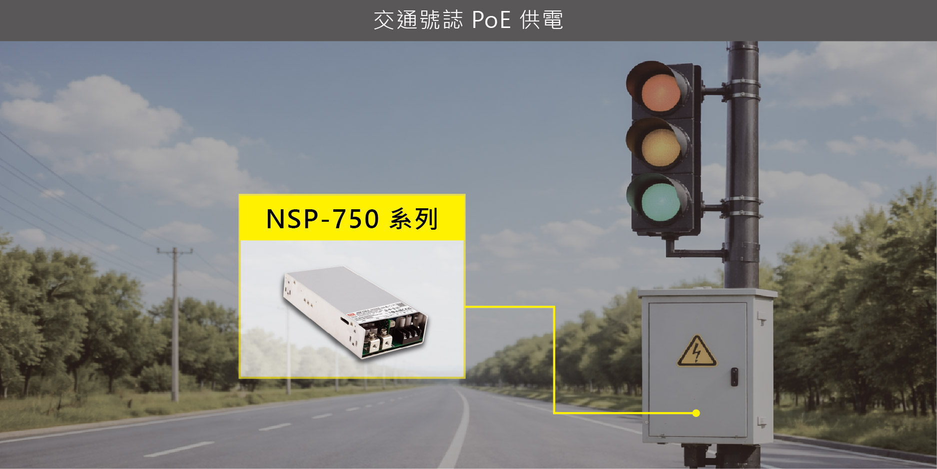 由於交通號誌控制系統需安裝在戶外,因此需要一個能夠在74°C環境溫度下穩定運轉並提供480W輸出功率的電源。NSP-750系列是理想的解決方案,它支援在-40°C~+85°C的寬工作溫度範圍內可靠運轉 PoE,確保在惡劣的戶外環境下也能穩定工作。