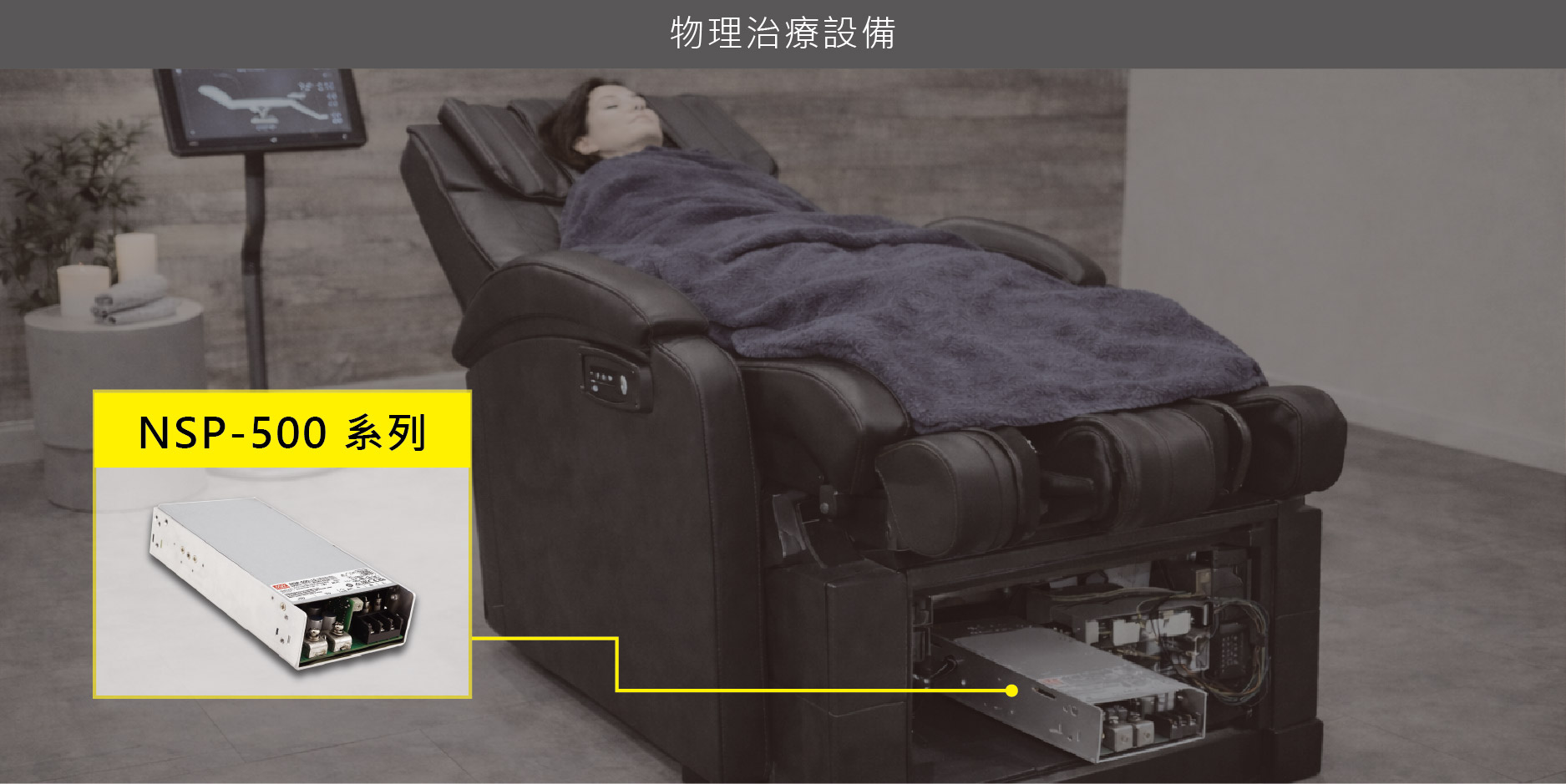 UL1647監理標準應用要求電源必須通過UL 62368認證,且漏電流要求極低(500 µA),以提高安全性。NSP-500系列電源符合此要求,已獲得 62368-1、60601-1、60335-1、61558-1/2-16、61010-1 和 62477-1 等全球認證,漏電流低於 350 µA,是物理治療設備應用的理想選擇。